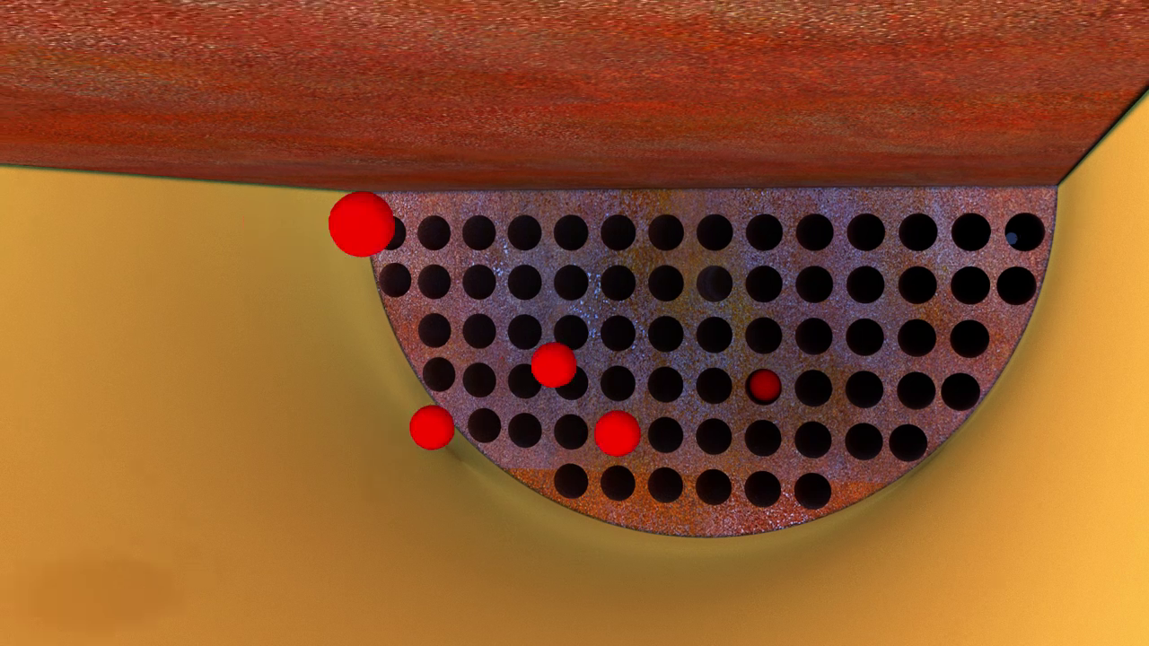 4. For a few seconds, the drain valve opens, and the balls are sucked back into the injector. Water turbulence cleans the balls as they enter the injector, and the clean balls are held until the next cleaning cycle begins.